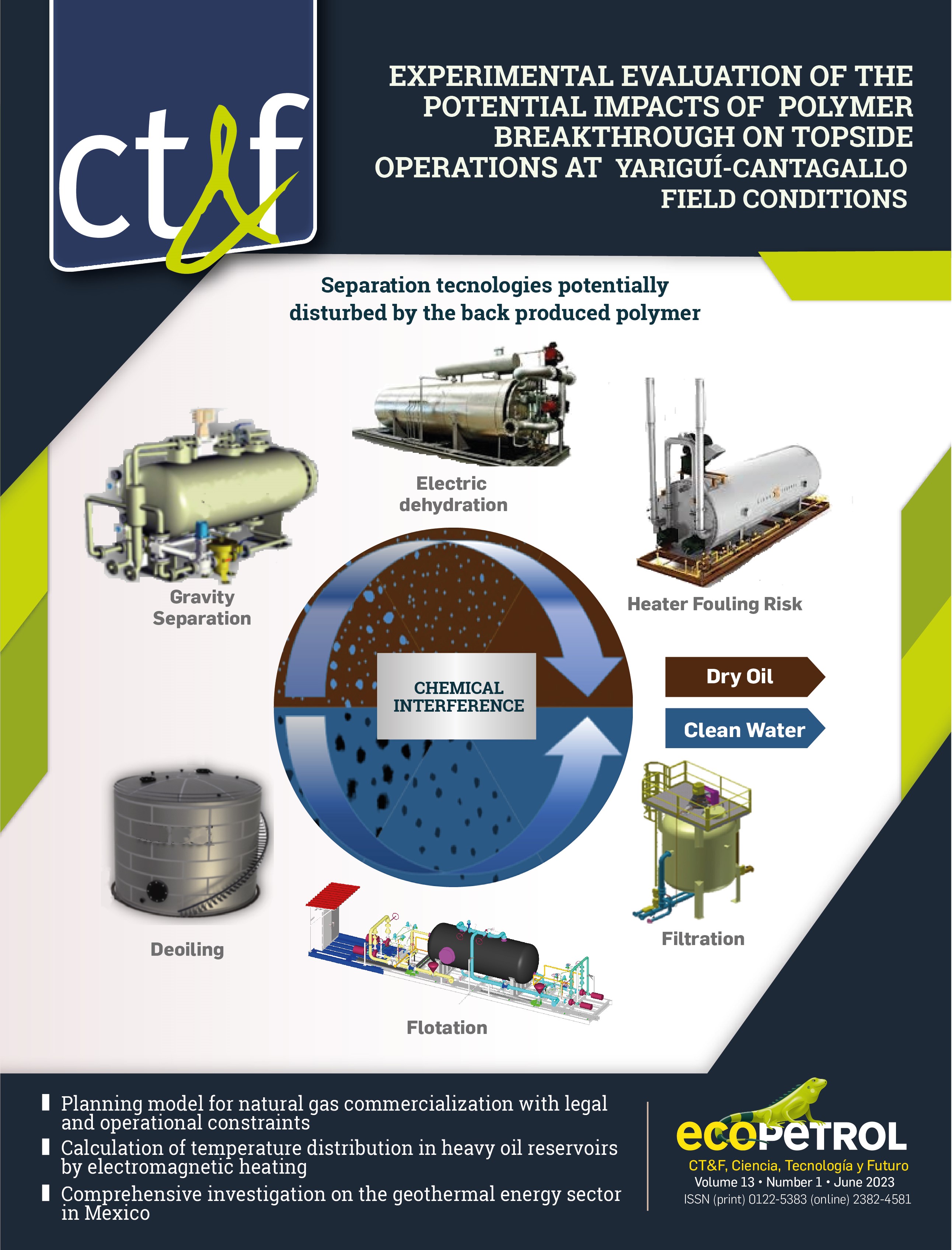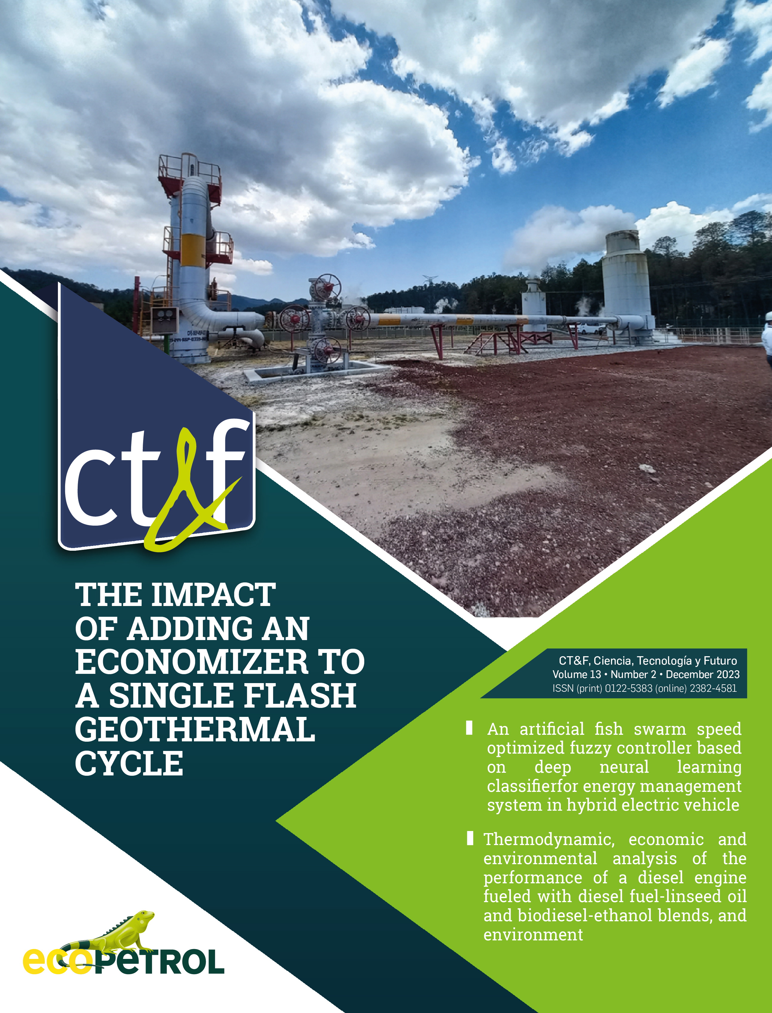 In this edition 13 No 2 of journal CT&F there are five papers published. A paper from a collaboration between Spanish and Mexican authors is related to the impact of introducing and economizer in a single flash plant for a geothermal case. The results show a marginal increase in thermodynamic and exergy efficiency using the economizer.